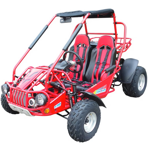 The TrailMaster 300XRSE GoKart is a NEW FUEL INJECTED full-size, electric start buggy with a big, liquid cooled, 17.4 HP, 300cc CVT fully automatic powertrain complete with reverse. The new EFI Electronic Fuel Injection never fails to start no matter the temperature or weather. It's packed with great features like a digital speedometer/odometer, stainless steel performance muffler, rack and pinion steering and adjustable steering wheel, a rear view mirror and a bikini sunshade top for those sunny days on the trails!The buggy also comes with bucket seats and five-point safety harnesses. The driver's seat is adjustable from 41 to 46 inches from the back of the seat back to the pedal so it can fit any size driver. The kart's beefy steel wheels feature 20X7-8 front & 22X10-10 tires rear and ride on adjustable heavy-duty shock absorbers and a 4-point rear swing arm for enhanced off-road handling. F&R Hydraulic disc brakes provide huge stopping power. Extra amenities include a parking brake, H&L beam head lights, all-around fenders, trailer hitch and large utility rack.