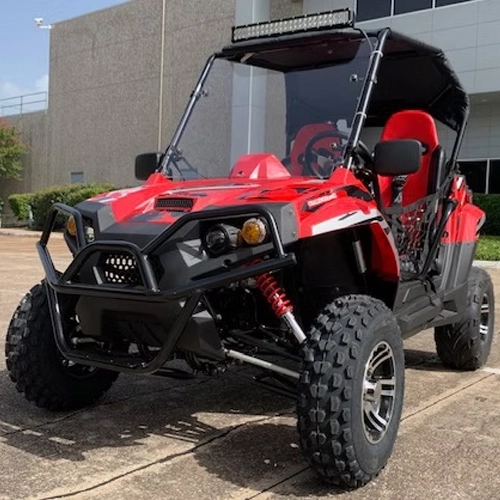 The front independent a-arm with shock absorber and rear swing arm goes over any tough terrain with ease. The deluxe model comes standard with alloy wheels, LED light bar, windshield, exciting graphics, and front steel bumper. Not to mention the features that always come standard on our Challenger series which includes but not limited to: digital speedometer/odometer, horn, adjustable steering wheel, 12v outlet, turn signals, bikini sunshade top, trailer hitch, front and rear disc brakes.