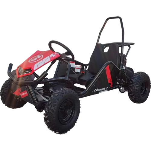 The TrailMaster Cheetah 3 is our smallest mini size Cheetah go-kart. It is an economy model with all the fun in a basic design. It targets the 6 to 10 year old range of kiddies for lots of fun! This new kid’s size Go kart includes the following main features: Sporty stylish design with an automatic CVT & Lifan 2.5 HP horizontal OHV engine with a manual choke. It has an adjustable seat with an adjustable pedal to seat back from 28” to 32”. The age group is 6-10 yrs, and can fit a person up to 5’2”. It comes standard with a rear rack and has (only) rear suspension for a comfortable ride. It has a lap safety seat belt and the Max speed is 21 m/h with a governor for safety.