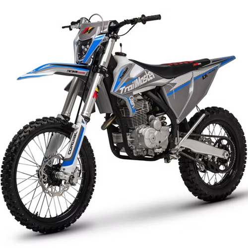 Trailmaster cooperating with JHL Offroad introduces The LX 250, a premium PRO-Series mid size dirt bike. It has both a kick start and a “ELECTRIC START” to start a high performance extremely reliable Zhongshen 249cc 4 stroke 14hp engine with a seat height of 37.4”and a slim weight of 266lbs. It is available in red, and blue colors. The LX250 features a 5 speed manual transmission with front and rear disc brakes, and inverted front shock. This is sure to be a HOT seller! As a Dual Sport bike it comes standard with Rearview mirrors, turn signals, speedometer and tail light. Additional standard premium items with our Pro-Series line include; large frame, inverted 54/60-950mm dual adjustable front shock absorber, high quality rear dual adjustable absorber, performance stainless steel muffler, high quality LED headlight with lens, CNC forged alloy wheels, high performance CHOCHO 520HDS chain, CNC alloy unbreakable levers, CNC forged alloy upper and lower triple clamps, 7 series aluminum alloy handlebar, waterproof wire harness, non-slip gripper seat, quality front and rear disc brakes. The bikes full on motocross ergonomics and race suspension system make handling feel natural and unforced, and help it navigate over any terrain. Electronic CDI ignition makes key and kick starting effortless, keeps the bike running smoothly in all gears and provides a broad, even power band.
