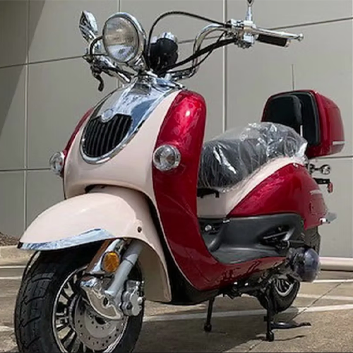 The Sorrento 150A has a fantastic two tone retro stylish look, matched color rear trunk, high quality chrome review mirror and etc. This model comes with a 150cc (8.7hp) engine w/ kick and electric start that has a max speed of 51 mph! Matching rear luggage trunk for books and supplies…this model is perfect for the college kid or for anyone to speed around town! Best of all, it comes with 1 year 10,000 miles engine warranty!
