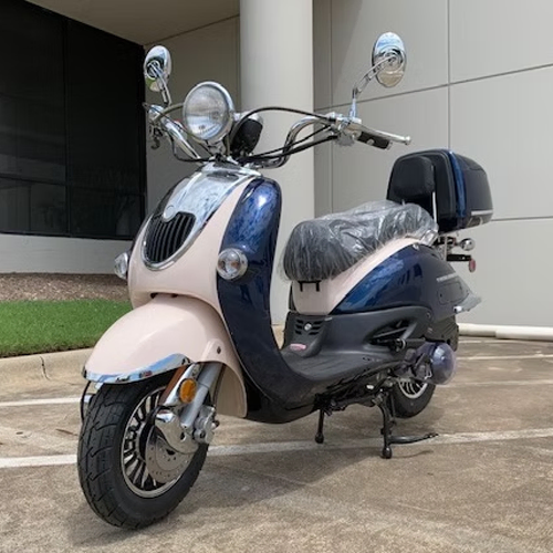 The Sorrento 50A has a fantastic two tone retro stylish look, matched color rear trunk, high quality chrome review mirror and etc. This model comes with a 50cc (2.95hp) engine w/ kick and electric start that has a max speed of 51 mph! Matching rear luggage trunk for books and supplies…this model is perfect for the college kid or for anyone to speed around town! Best of all, it comes with 1 year 10,000 miles engine warranty!
