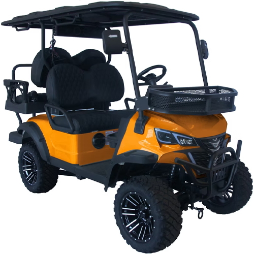 The TBM X4 is a an electric golf cart with a 48v system centered around a 5kw 105ah battery capable of an average 48 mile range. With a foldable windshield, carbon fiber steering wheel, 22” aluminum rims and led head lights and blinkers this is machine turns heads. It has a high strength carbon steel frame with comfortable cushion seats front and rear.
