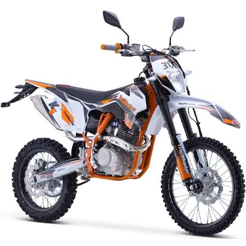 The TM 31X-250 is a great full size dirt bike. It is has both a kick start and a new “ELECTRIC START”. It has a high performance 223cc 4 stroke 16hp engine with kick start and a top speed of around 55 MPH and a seat height of 34.6”. It is available in red, green, and orange colors. The TM31X features a 5 speed manual transmission with front and rear disc brakes, inverted front shock, and a lightweight steel tube frame! This is sure to be a HOT seller! The bikes full on motocross ergonomics with a 19” front / 16” rear wheel and race suspension system, make handling feel natural and unforced, and help it navigate over almost any type of terrain. The Headlight, Digital Dashboard, Rear View Mirrors, Turn Signals, horn, license plant mount and brake lights comes standard on the X model. Electronic Digital CDI ignition makes key and kick starting effortless, keeps the bike running smoothly in all gears and provides a broad, even power band. And at only 297 pounds, the 223cc engine can propel the motorcycle to speeds of more than 55 miles per hour.