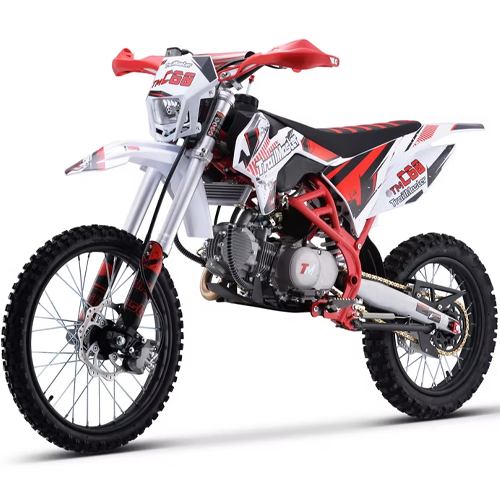 The TM C60 is a great mid size dirt bike. It has a high performance 156cc 4 stroke 14hp engine with kick start and a top speed of around 55 MPH and a seat height of 34.6”. It is available in red, green, and orange colors. The TM C60 features a 4 speed manual transmission with front and rear disc brakes, and inverted front shocks! This is sure to be a HOT seller! The bikes full on motocross ergonomics and race suspension system make handling feel natural and unforced, and help it navigate over almost any type of terrain. Electronic CDI ignition makes kick starting effortless, keeps the bike running smoothly in all gears and provides a broad, even power band. And at only 190 pounds, the 156cc engine can propel the motorcycle to speeds of 55 miles per hour.